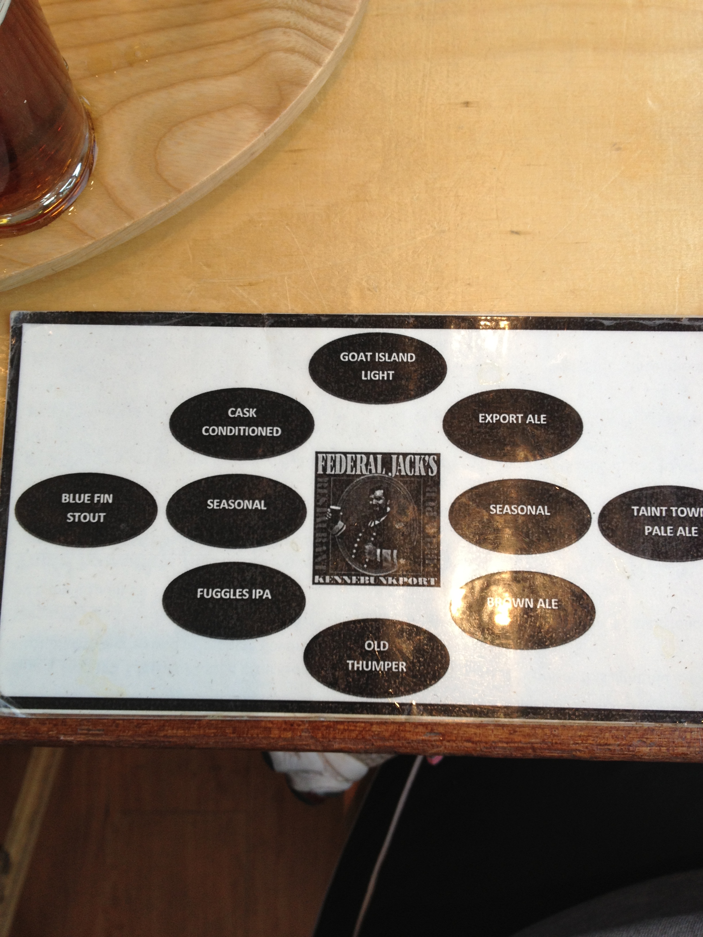 The original Shipyard is a little place in Kennebunk, Maine, called Federal Jack’s. If you can deal with the hordes of tourists in Kennebunk on a nice day, then I suggest a stop at Federal Jack’s. If you can get a seat next to the window overlooking the water, then it has some great charm. If you get seated toward the interior, expect to be crowded in with all the other tourists. The beer here is a mixture of Shipyard and Sea Dog and the sampler is huge.