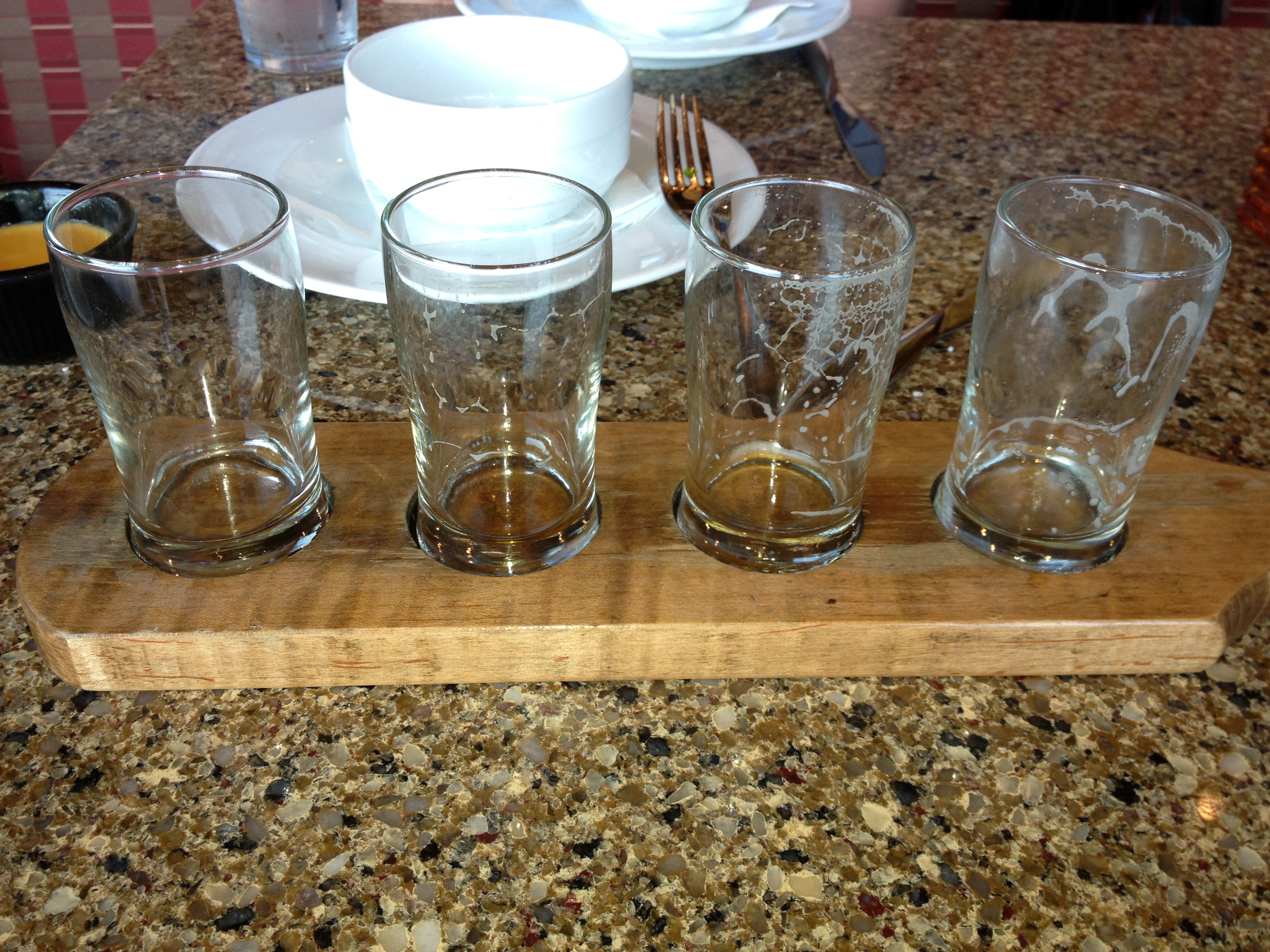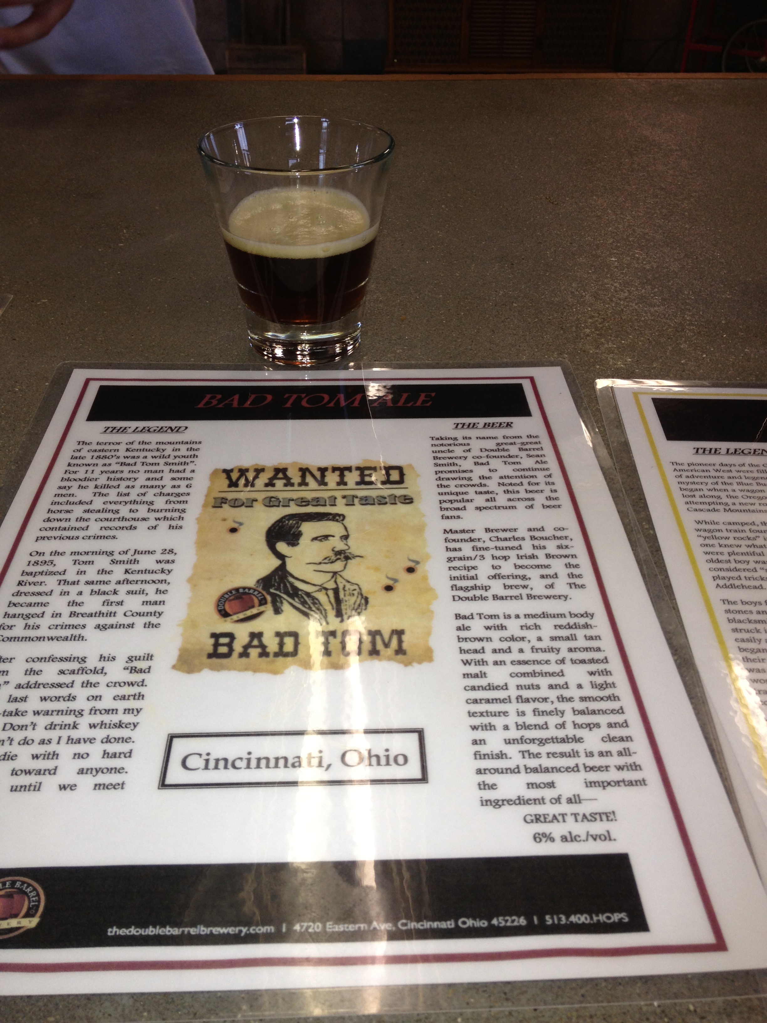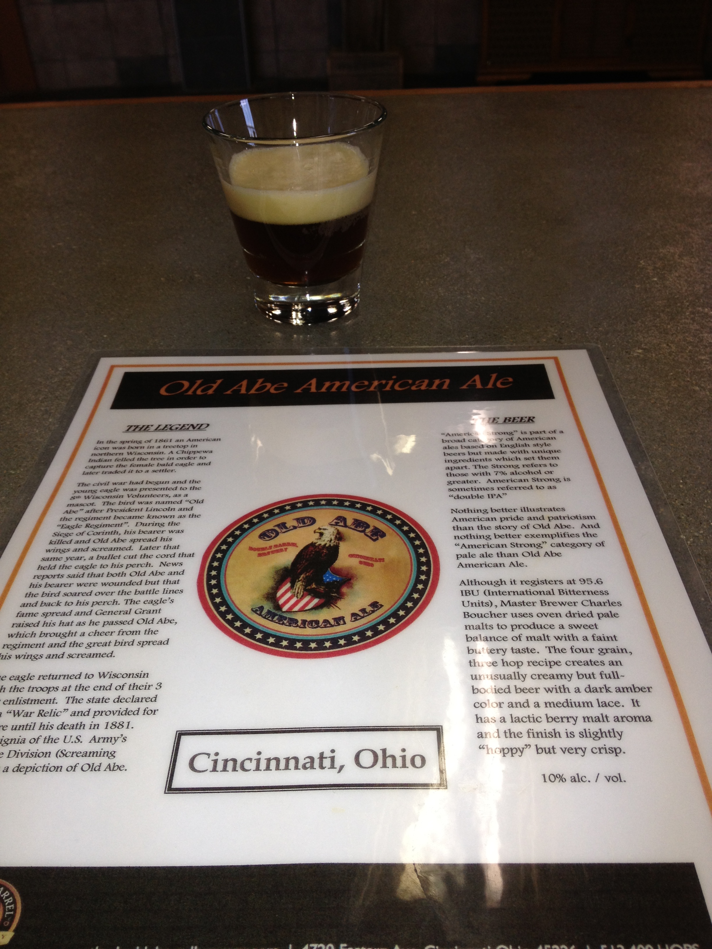The beers are all good. However, none of them tasted as I would have expected them to based on the names and style of beer. The Old Abe American Ale is the strongest beer with an alcohol content of close to 10%. I am not usually a lover of high alcohol beers as they often taste like someone poured some type of spirit into the beer. This Old Abe American Ale was very smooth and did not have that heavy alcohol taste. I was very impressed by this beer. The Applehead IPA didn’t have that hoppy IPA taste that I generally love but had a more sweet finish that hinted at almonds. Although I wouldn’t get this beer if I wanted a great IPA, I found it very drinkable. The Belgium Ale had a very grapefruit taste not the more lemony taste of a traditional Belgium. If you like grapefruit, it might be a great beer for you. The signature beer is the Bad Tom Ale–a good beer and a good solid ale. The greatest thing about this beer though is the accompanying story that explains the name. Bad Tom was a local outlaw, hung for his past transgressions that he blamed on women and drink. Actually all the beers are accompanied by interesting stories explaining their origins. To me, this signals great thought and creativity in naming and creating the beers. If you’ve been reading my blogs, I always give points for creativity!