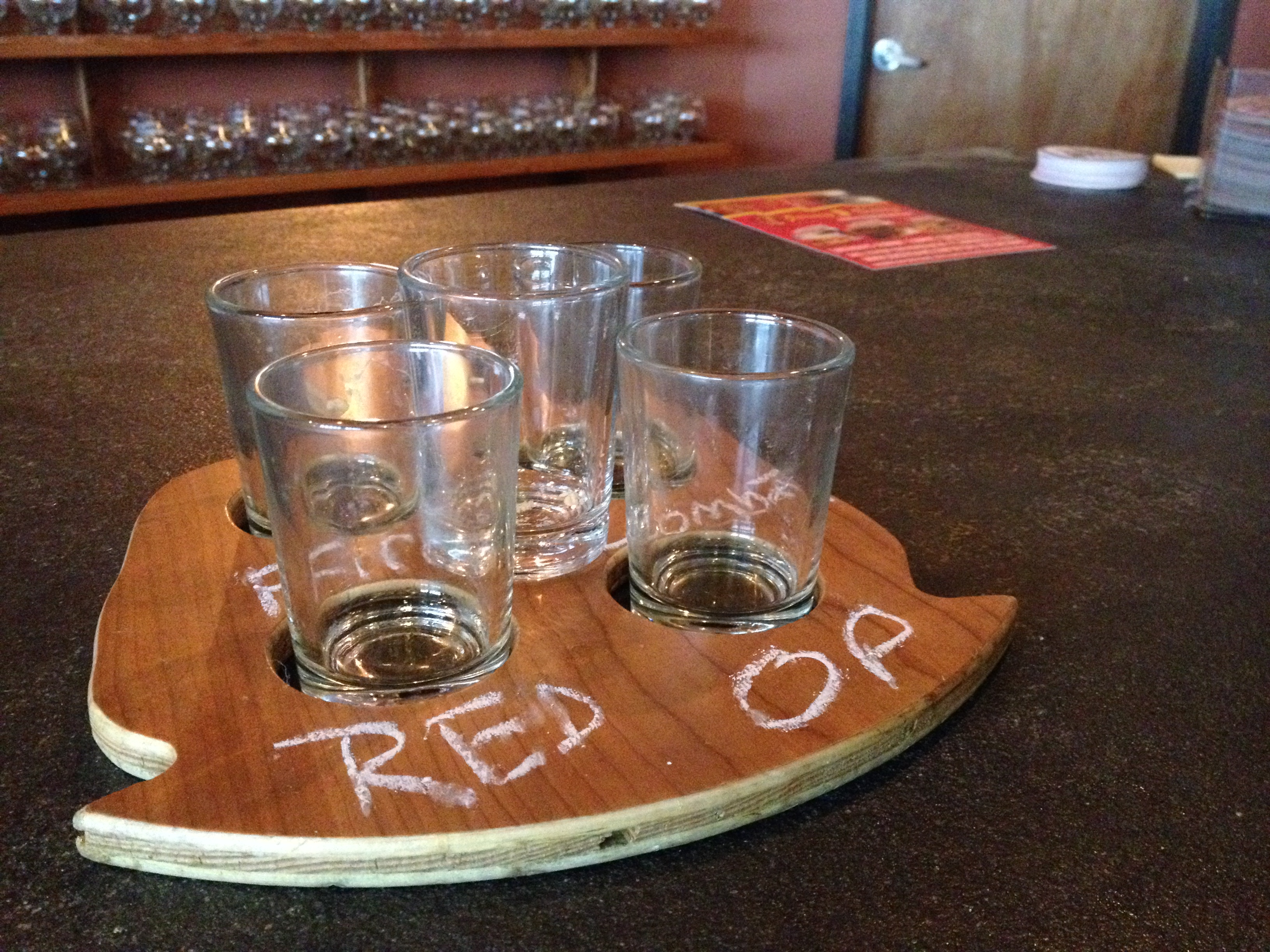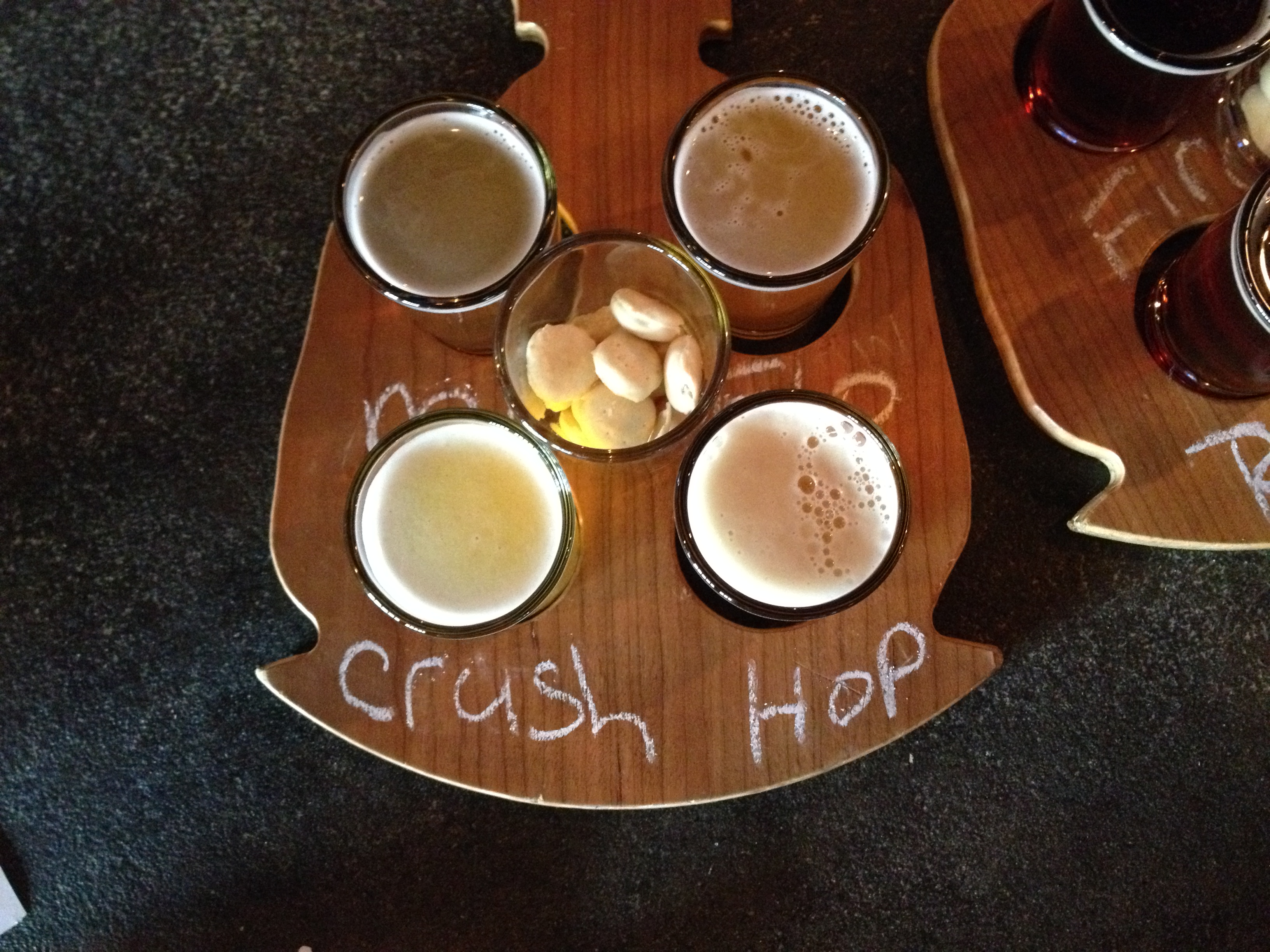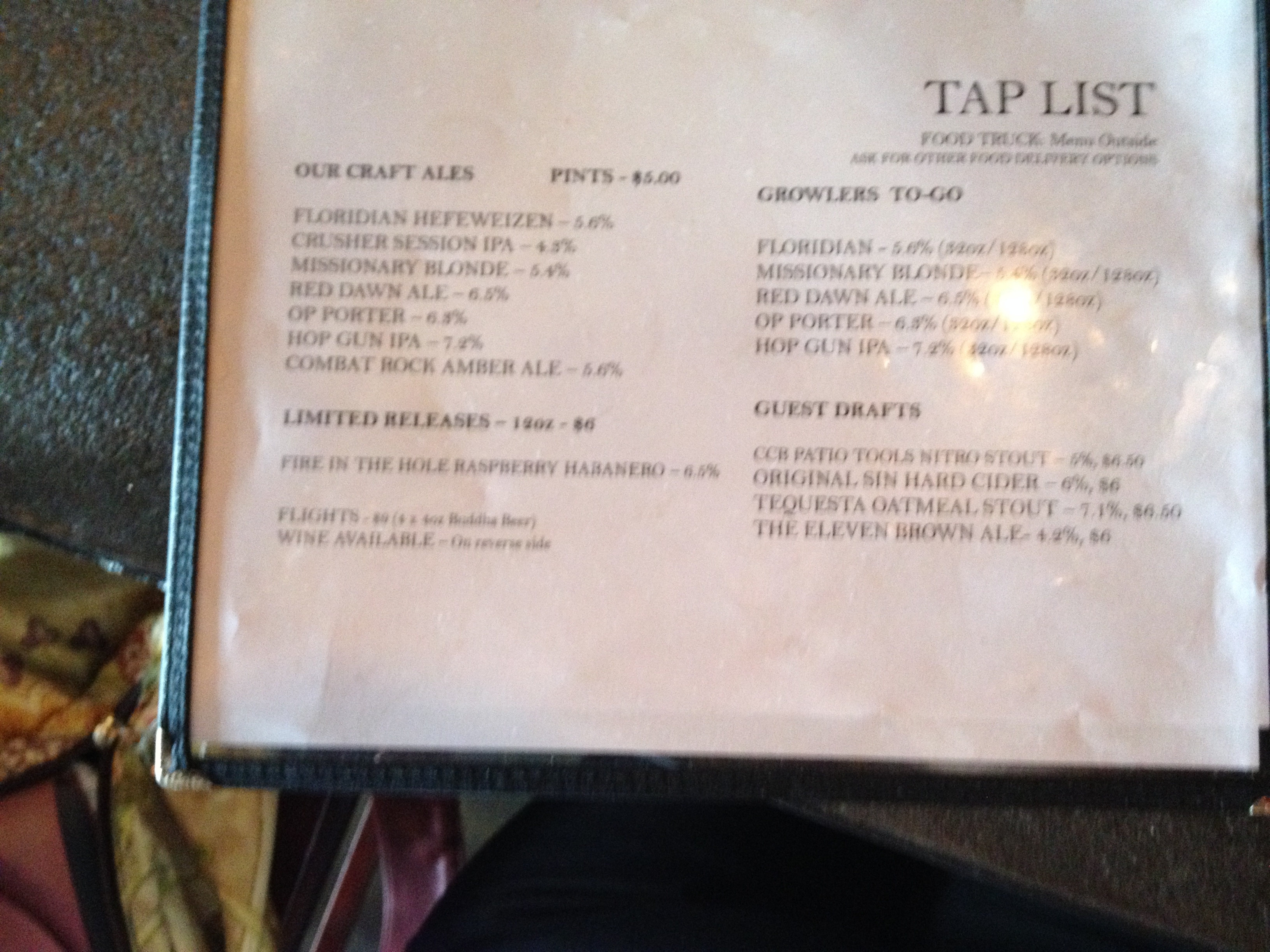 Not to harp too much on the tasting room, the beers are very good here too. The Floridian Hefeweizen was very light and refreshing with traditional hints of clove and banana. I had to go for a whole pint of this one as I am starting to rekindle my taste for hefeweizens. The Crusher Session IPA was a low to medium hopped beer that would be great for someone who wants some hops but is not a true “hop head.” The Missionary Blonde was not my favorite as it had a little bit of an aftertaste that reminded me of tar. The Hop Gun IPA was similar to the Crusher Session in taste but had a bit more alcohol content and a more amber color. The Red Dawn Ale was OK according to my husband because as everyone knows I am not a fan of reds. The taste reminded me a bit more of brown ale than a red and had a hint of spice reminiscent of nutmeg. The OP Porter was a good solid porter and would be great if we ever had a cold night. The Combat Rock Amber was very mild and reminded me a bit of Killian’s red. The most surprising beer of the evening was Fire in the Hole, a raspberry Habanero brew. I personally would have never though that raspberries and Habaneros would go together, and I certainly wouldn’t think they would mix well in a beer. However, I actually quite enjoyed this beer. The raspberry and Habanero were both very evident on the nose and in the taste. The Habanero imparted a short burn on the back of the throat that was not overpowering. I don’t think it is a beer that I could drink more than a few ounces of– but it was a great and unique taste sensation.
