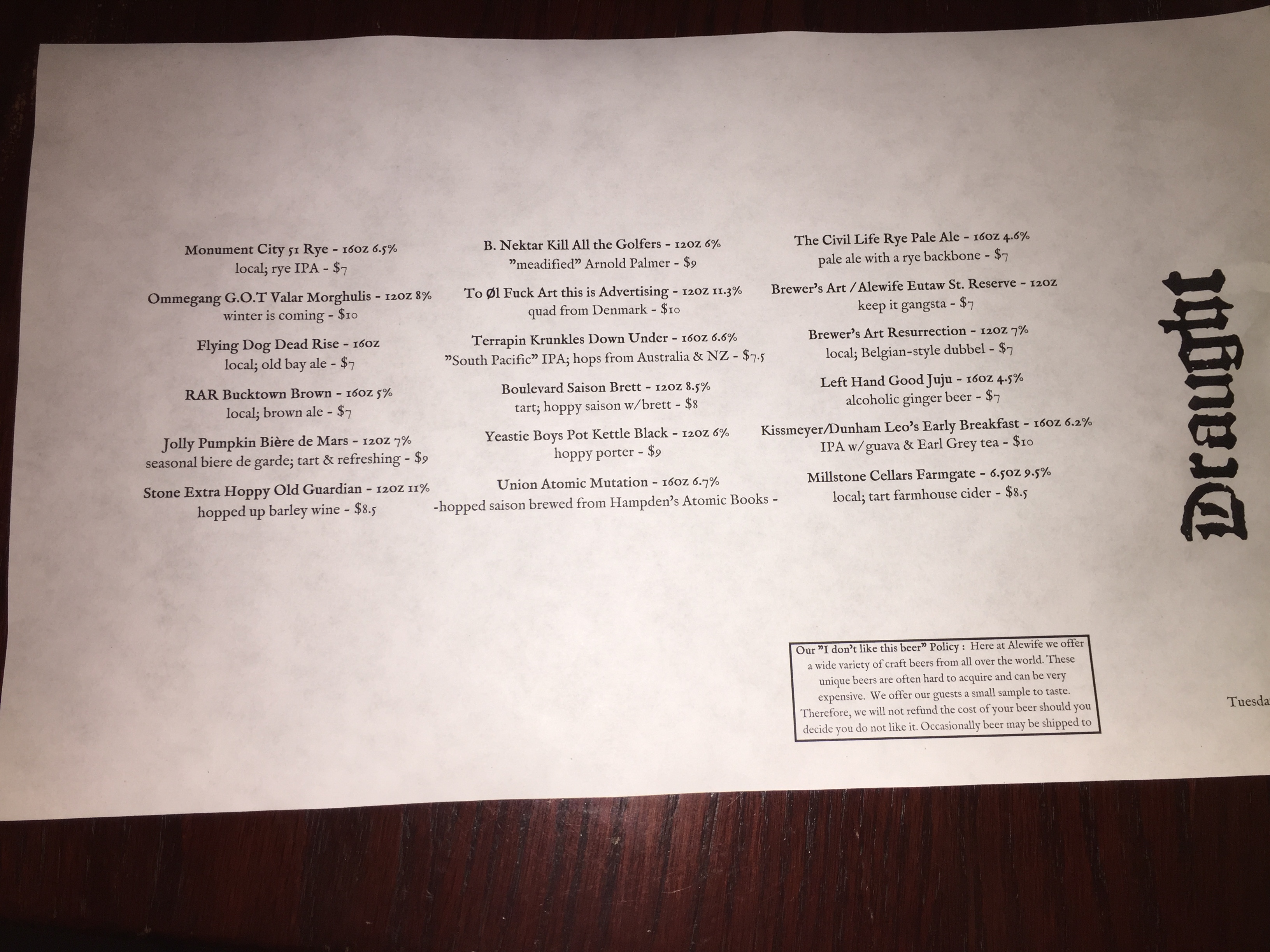 Unfortunately, this was just a small sampling of their menu. I would have loved to try more but I had several stops to make and had to drive across town. If I got back to Baltimore anytime soon this is a definite stop. I have a couple of bottles that I brought back that are not on this list. When I try them, I will try to update this blog.