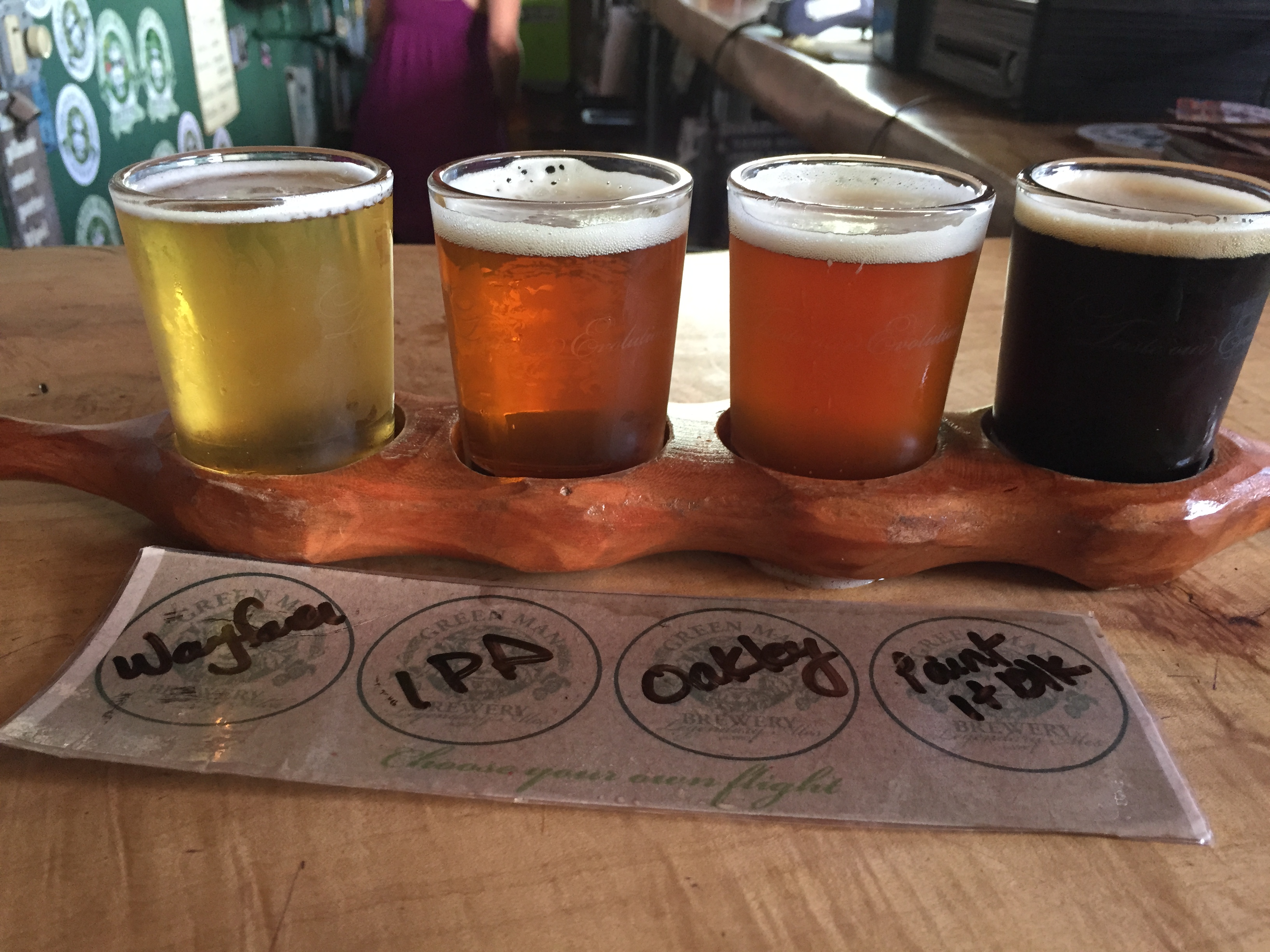 After the flight it was back up the street to find Green Man Brewery. Another flight awaited me there of Wayfarer, IPPA, Oakey Lafarge, and Paint it Black IPA. I also got to taste a guest tap from Pisgah Brewing, Pisgah Pale Ale.
